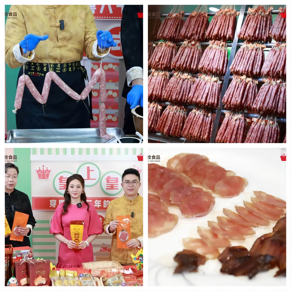 想知道皇上皇臘腸有什么獨家配方嗎?直播間現場特邀非遺大師池東和鑒評大師黃迪現場制作臘腸并講解步驟,各位觀眾,你的DNA動了嗎?