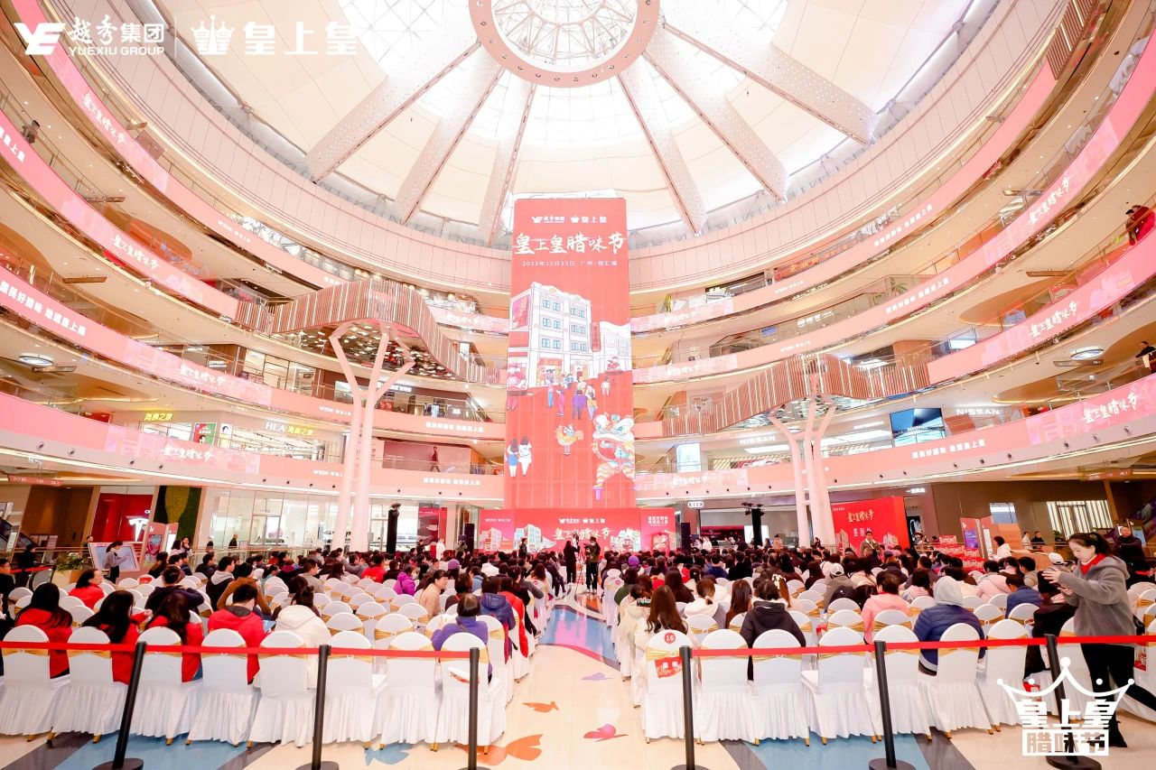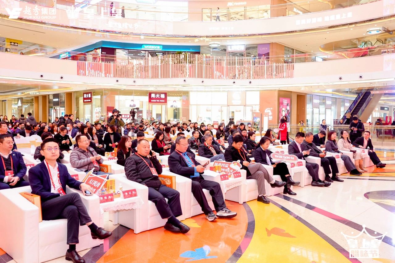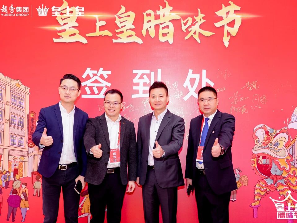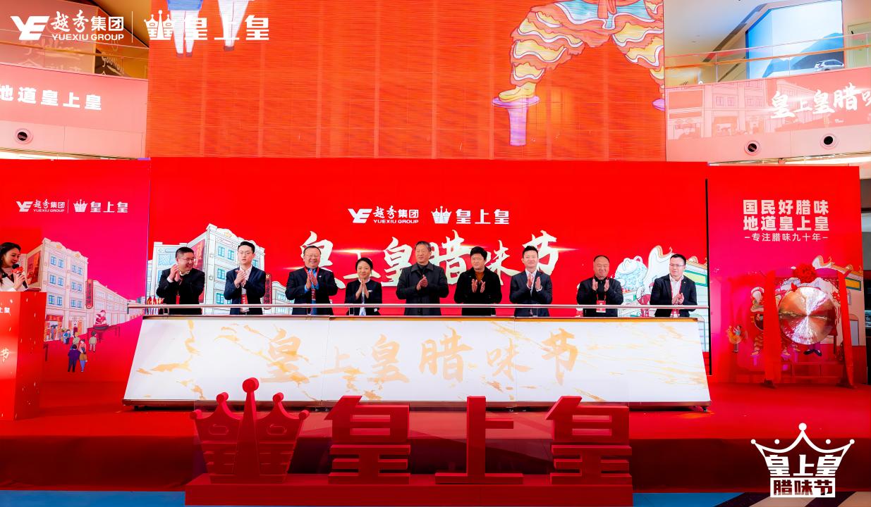 來到皇上皇臘味節啟動儀式環節,越秀集團首席財務官陳靜、皇上皇食品公司董事長易聰,與市國資委企業黨建處一級調研員吳龍、市商務局特商處處長李國文、廣州老字號協會會長蘇廣豐、廣州市文化館黨支部書記牟遼川、京東集團副總裁葉威、京東生鮮及預制菜業務部總經理周曉舟等領導一同上臺推桿為活動盛大啟動。