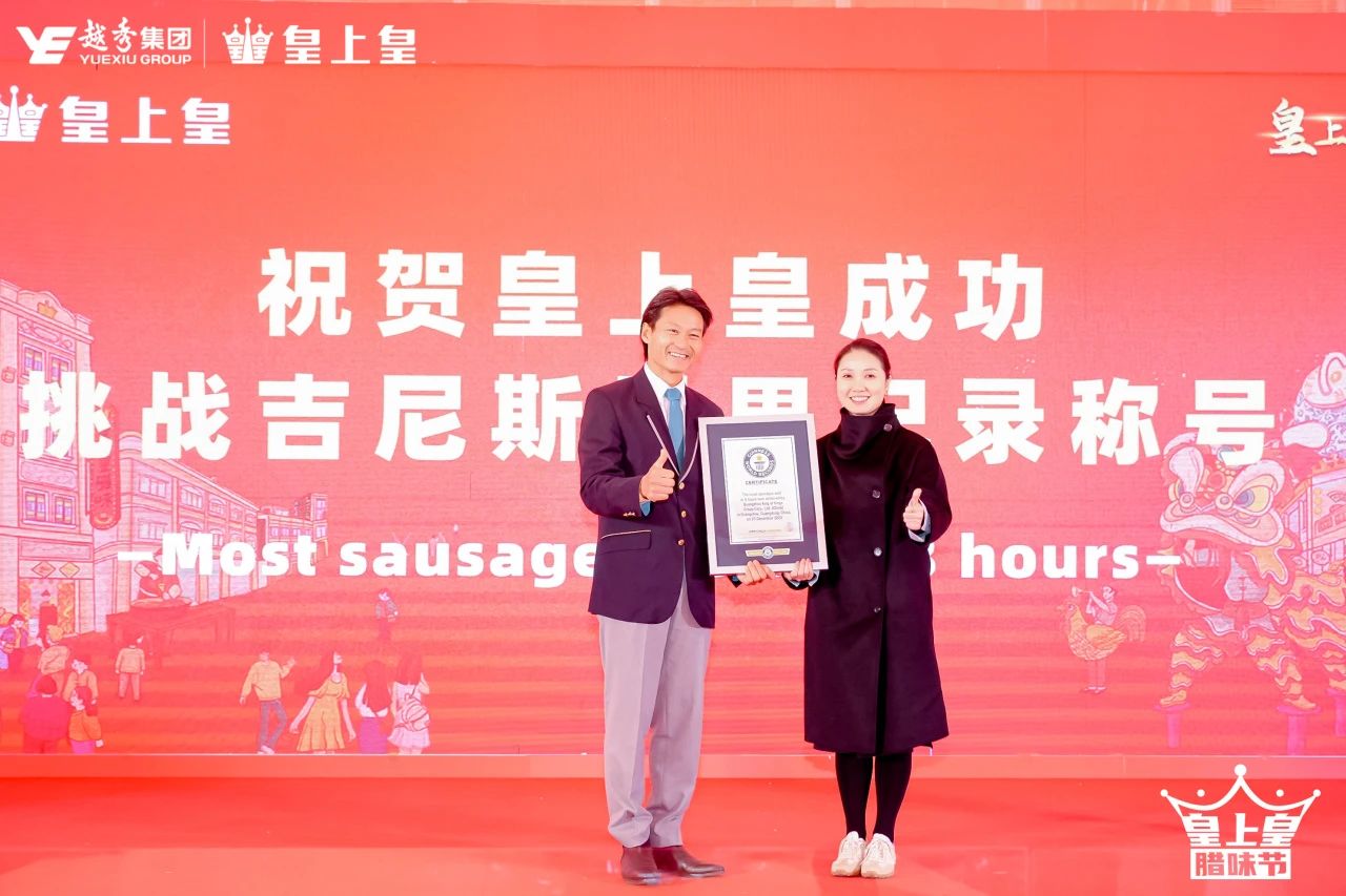 截止至12月23日晚上20:00,皇上皇創下連續8小時內銷售最多臘腸世界紀錄,總計5986根,超出設定紀錄3倍之多!吉尼斯記錄挑戰成功!作為中華老字號品牌,皇上皇臘味的這一成就再次證明了其作為臘味之王的實力和地位。