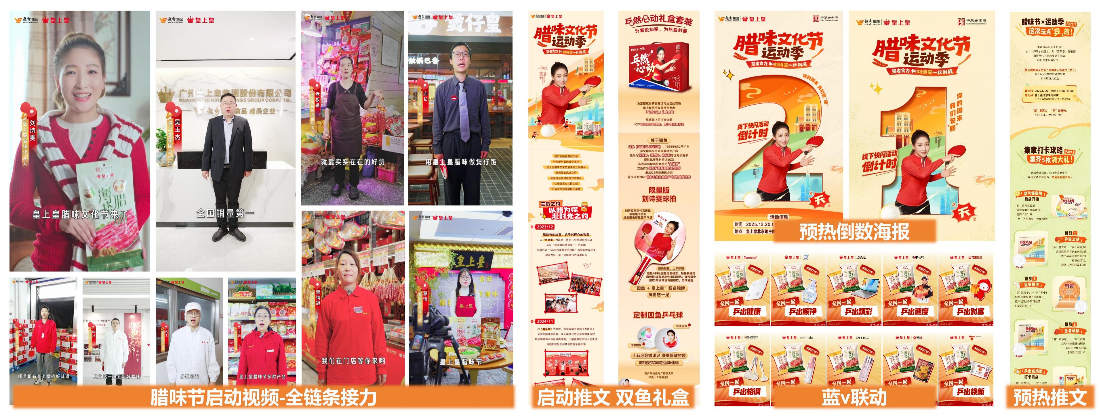 為強化活動曝光與用戶期待,皇上皇線上線下構建多維度預熱矩陣。線上發布劉詩雯《冠軍的家?!放D味節主題TVC,并以長圖文推文及全鏈條接力視頻形式宣布臘味節正式啟動,累計播放及曝光超30萬次;提前釋放皇上皇×雙魚×劉詩雯聯名禮盒信息,引發粉絲與泛受眾討論,同步強化“國球推廣+匠心臘味”價值與皇上皇“廣州手信”的文化屬性。同時,開展跨行業品牌藍V聯動,覆蓋730萬+跨圈層粉絲,全方位擴大活動影響力,為線下活動鋪墊流量與情感基礎。