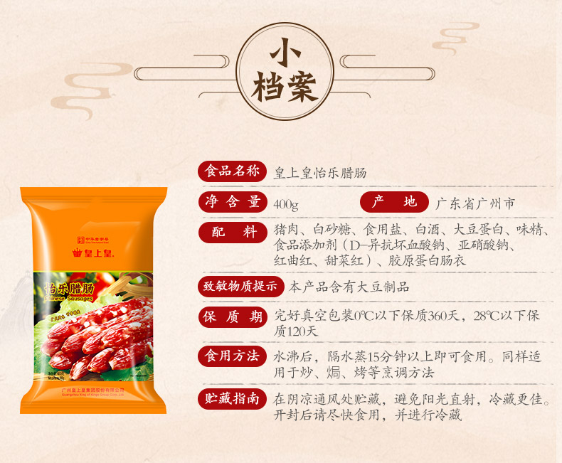 豬肉、白砂糖、食用鹽、白酒、大豆蛋白、味精、食品添加劑(D-異抗壞血酸鈉、亞硝酸鈉、紅曲紅、甜菜紅)、膠原蛋白腸衣
